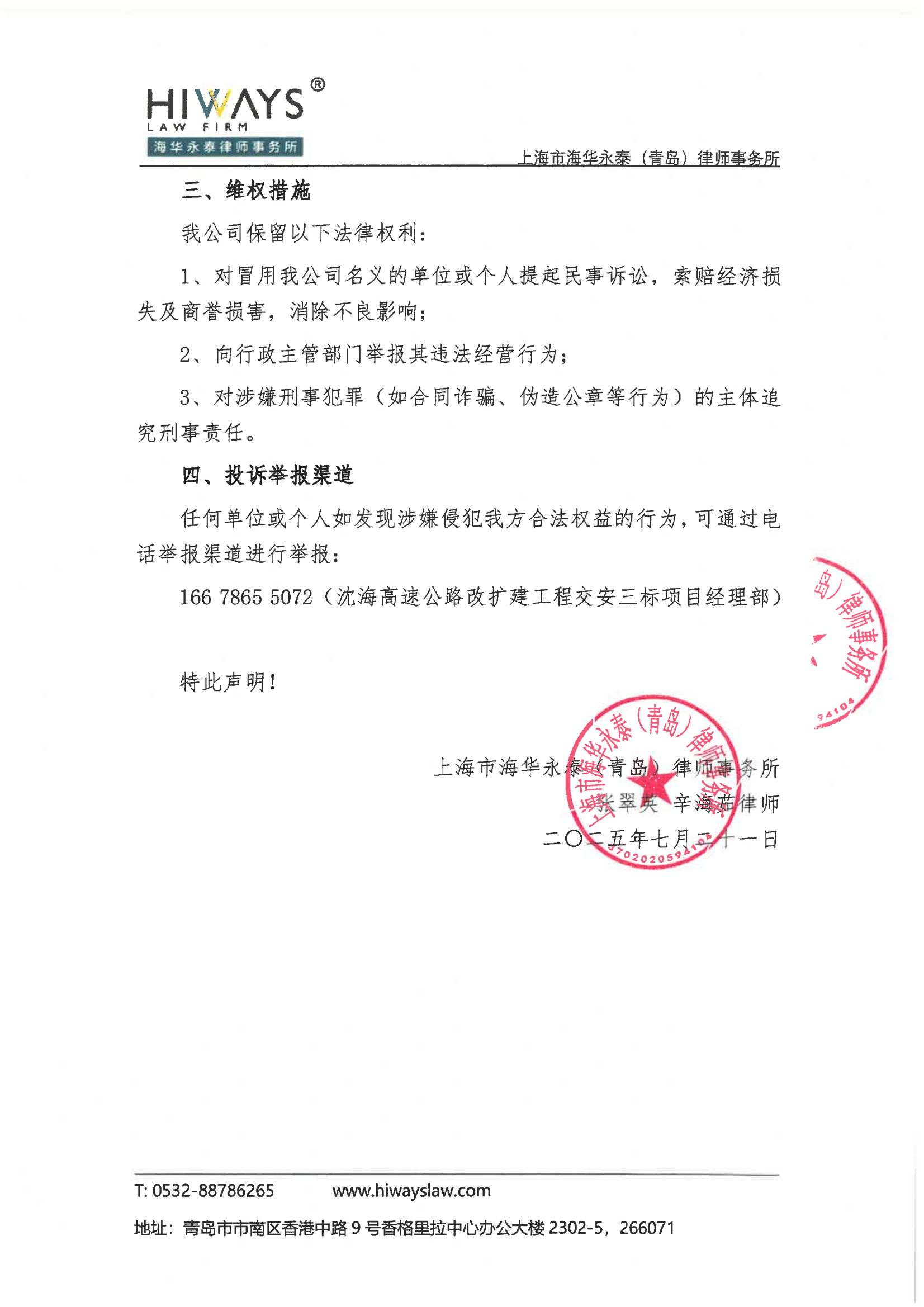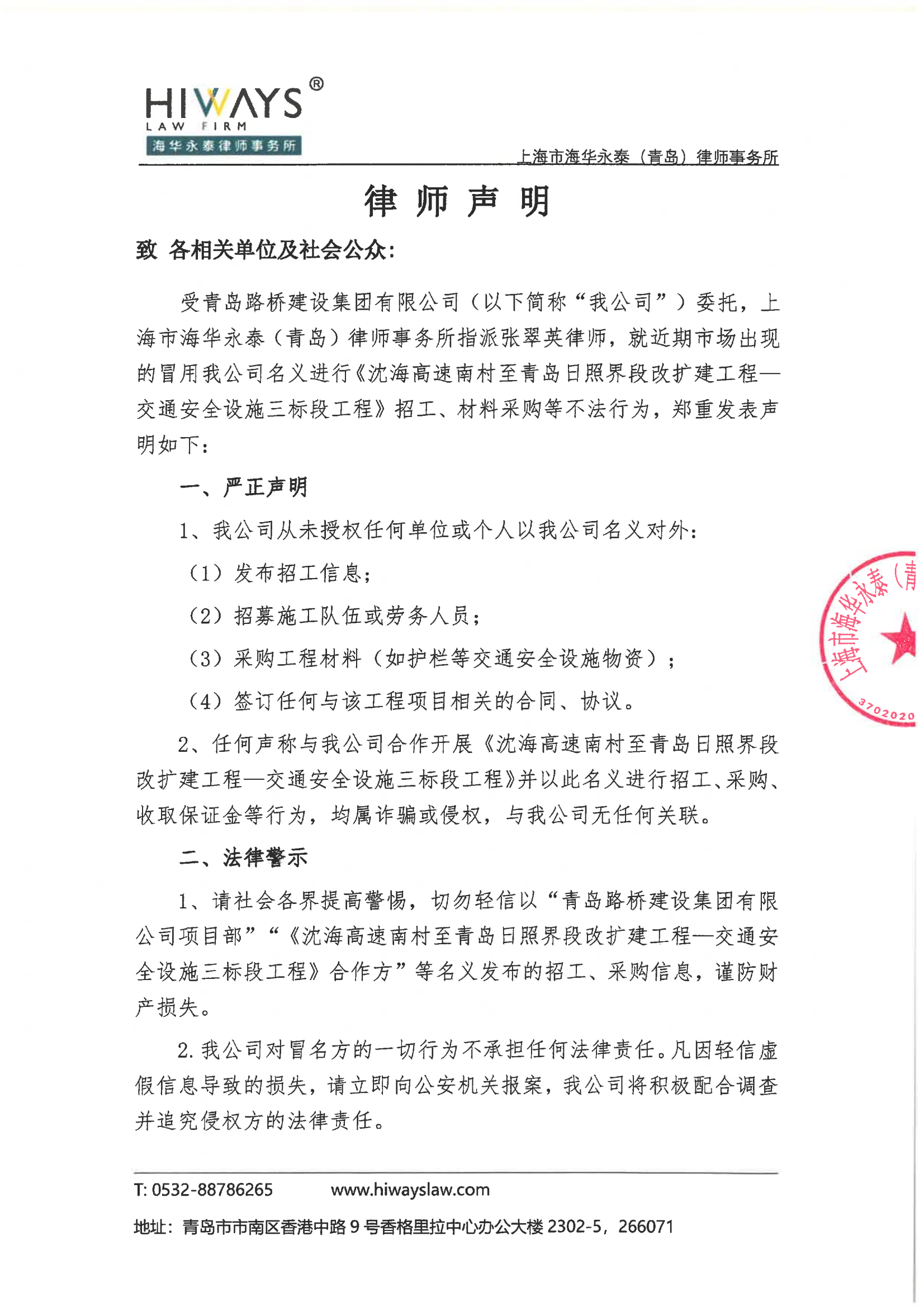 關于沈海高速南村至青島日照界段改擴建工程—交通安全設施三標段工程招工、材料采購等不法行為的律師聲明